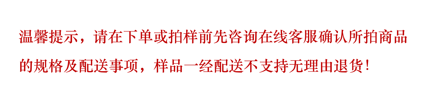 1.温馨提示,请在下单或拍样前先咨询在线客服确认所拍商品的规格及配送事项,样品一经配送不支持无理由退货! 2.本活动商品下单付款后,会在达到一定的数量后才统一发货配送,介意的请勿下单。 3.订单需要支付一定的保证金才能生效,如该活动商品在有效期间内数量人数不够,则会退还所支付的保证金。
